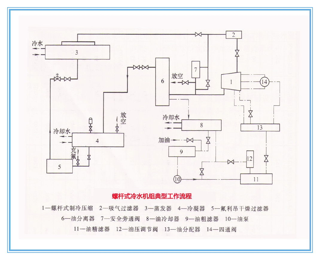 螺桿式冷水機組的典型工作流程如下圖所示,它由制冷系統(tǒng)和潤滑油系統(tǒng)兩部分組成。制冷系統(tǒng)的工作流程為:制冷劑在蒸發(fā)器中汽化,所產(chǎn)生的蒸氣經(jīng)過吸氣過濾器進入壓縮機。制冷劑在壓縮機中被壓縮成高壓氣體,同時潤滑油噴入壓縮機中與制冷劑一起被壓縮,壓縮后潤滑油和制冷劑進入油分離器,其中無油的制冷劑進入冷凝器,在冷凝器中變?yōu)轱柡鸵后w后進入過冷器過冷,變?yōu)檫^冷液體,然后流向節(jié)流閥,經(jīng)過節(jié)流降壓降溫后進入蒸發(fā)器。潤滑油系統(tǒng)由油分離器、油冷卻器、油過濾器、油泵、油壓調(diào)節(jié)閥、油分配器和四通閥組成,其工作流程為:從油分離器分離出來的潤滑油,為避免油溫過高降低潤滑性,先經(jīng)過油冷卻器進行冷卻,然后在沒泵作用下經(jīng)過油粗濾器、油精濾器進入油分配器,接著分成兩路進入壓縮同。一路去潤滑軸承并起冷卻作用,另一路去壓縮機噴射。